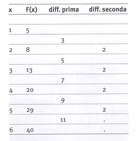 Si abbia, per esempio, la funzione F(x)= x 2 + 4 e si calcolino a mano i suoi primi valori; i valori successivi si possono calcolare con semplici somme dalle differenze successive. Nel nostro esempio, avremo i valori: F(1) = 5, F(2) = 8, F(3) = 13 e F(4) = 20. Le loro differenze prime e seconde sono rappresentate dal seguente quadro: