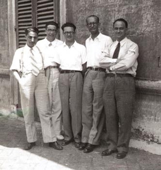 I "ragazzi di via Panisperna": (da sinistra) Oscar D'Agostino, Emilio Segré, Edoardo Amaldi, Franco Rasetti ed Enrico Fermi