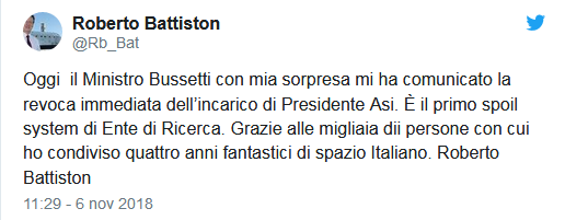 Con un annuncio sul suo profilo personale di Twitter, il fisico Roberto Battiston ha annunciato di essere stato rimosso – con una comunicazione del ministero dell'Istruzione, dell'Università e della Ricerca Marco Bussetti – dal suo incarico di presidente dell'Agenzia Spaziale Italiana (ASI). Battiston era stato nominato per la prima volta presidente dell'ASI nel 2014 e lo scorso maggio il suo mandato era stato rinnovato dall'ex ministro Valeria Fedeli fino al 2022. Il curriculum di Battiston non ha nulla da invidiare: classe 1956, è docente di Fisica sperimentale presso l'Università di Trento; ha lavorato a numerose ricerche scientifiche fra cui quelle per lo studio dei raggi cosmici e alcuni dei progetti cui ha collaborato si sono tradotti in strumenti ancora oggi presenti sulla Stazione Spaziale Internazionale.