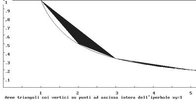 Ho scritto un altro programma per calcolare la somma delle aree dei triangoli i cui vertici sono sempre sull’iperbole xy = 1, partendo da 1 e saltandone due (cioè usando i triangoli 1 4 7, 7 10 13, 13 16 19, ecc). Il risultato è: