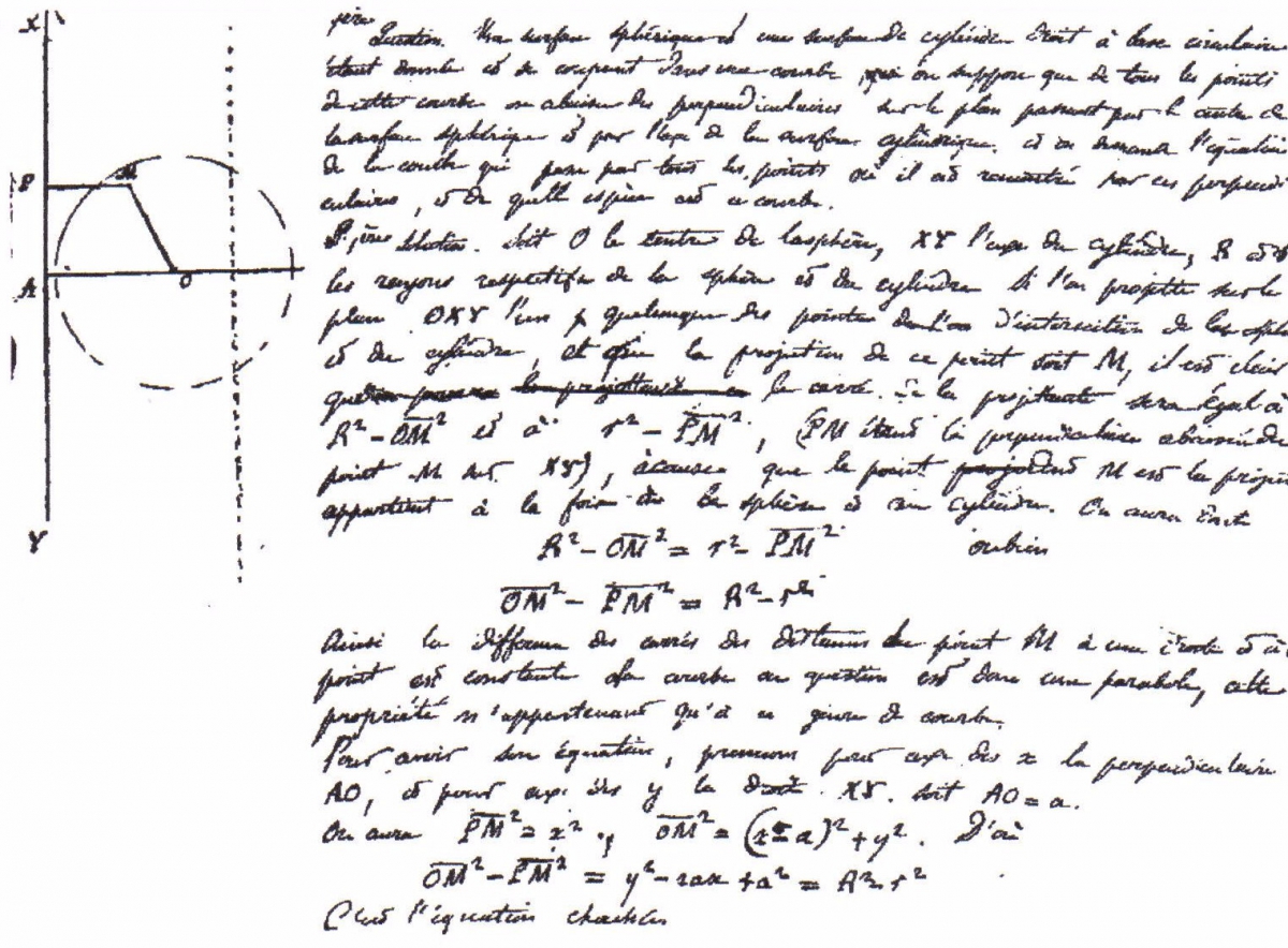 4. Un altro scritto significativo è la prima pagina del compito svolto da Galois al Concorso Generale per docenti delle scuole, tenutosi nel 1829 (vedi [1], pag. 424). Del manoscritto ci è pervenuto solo questo frammento, sotto forma di fotografia. L'elaborato riguarda la determinazione di una curva descritta come luogo nello spazio. La soluzione proposta da Galois prescinde da difficili visualizzazioni tridimensionali (tradurre l'enunciato in una figura è praticamente impossibile) e da astrusi calcoli analitici: il problema viene ricondotto a due banali situazioni nel piano, in cui si applica semplicemente il teorema di Pitagora. I due triangoli rettangoli considerati hanno un cateto in comune e per concludere basta uguagliare le due differenze di quadrati che esprimono la sua lunghezza. L'identità risultante descrive una parabola. Ecco una sonora smentita diretta a chi respinge la geometria solida, ritenendola troppo difficile da "disegnare" e troppo complicata da "scrivere".