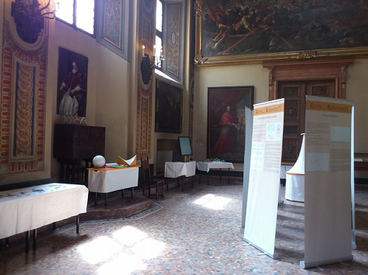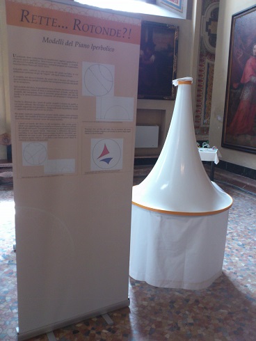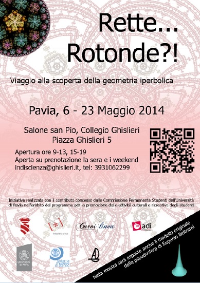 “Rette… Rotonde?!” è una mostra itinerante, che abbiamo presentato in anteprima al Festival della Scienza di Genova 2013 e che ora esponiamo a Pavia, presso il Collegio Universitario Ghisleri con la collaborazione dell’Associazione Dottorandi Pavesi e dell’Università degli Studi di Pavia (che in via eccezionale ci ha concesso di esporre in quest’occasione il modello originale di “pseudosfera” realizzato da Eugenio Beltrami e conservato presso il Dipartimento di Matematica).