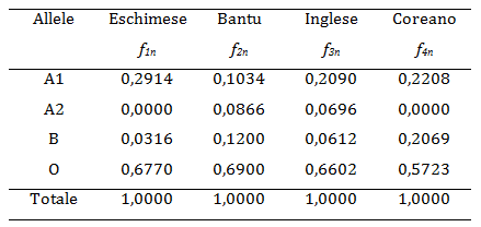 Per il loro esperimento gli autori hanno scelto elementi delle quattro popolazioni (indicate nella tabella sottostante) e di ogni gruppo hanno determinato le frequenze fin dei geni nei gruppi di sangue A B 0.