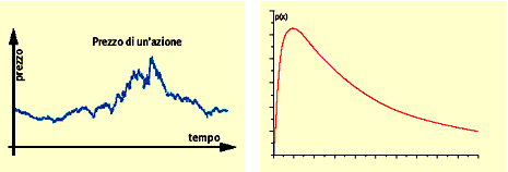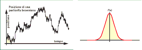 Fig. 2 La posizione di una particella in un moto caotico browniano unidimensionale, confrontato, sotto, con il tipico andamento del prezzo di un'azione. A destra, la tipica distribuzione di probabilità di Gauss.