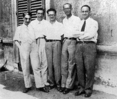 Edoardo Amaldi, al centro, nel 1934, con D'Agostino, Segre (alla sua sinistra), Rasetti e Fermi (alla sua destra).