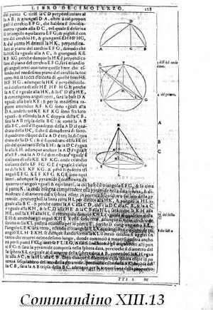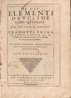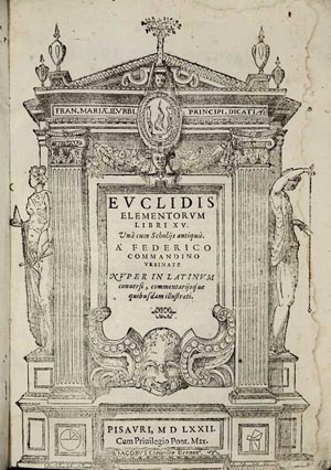 Non ultimo è da ricordare è il suo lavoro sugli “Elementi” di Euclide a cui arriva per richiesta dell’allora principe Francesco Maria della Rovere del quale era il precettore (l’allievo si lamentava con il maestro dei numerosi errori presenti nei testi allora in uso). E’ noto che gli “Elementi” di Euclide – dopo la Bibbia – costituiscono il testo che è stato più pubblicato e tradotto in tutto il mondo. Commandino pubblica prima un testo in latino e poi una traduzione in volgare nel 1575, stampata in casa dello stesso autore. Purtroppo le ultime stampe del libro coincidono anche con la morte dell’autore.