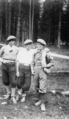 Edoardo Amaldi (a destra) con i fratelli Giorgio e Mario Salvadori, di ritorno da una salita al Campanile Rosà (estate 1927)