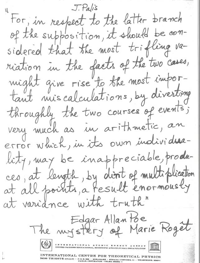 Ho conservato la fotocopia dei lucidi di quella lezione di Palis, di cui riporto sotto quello in cui è riprodotto (con la grafia di Palis) il passo di Poe (ovviamente in inglese):