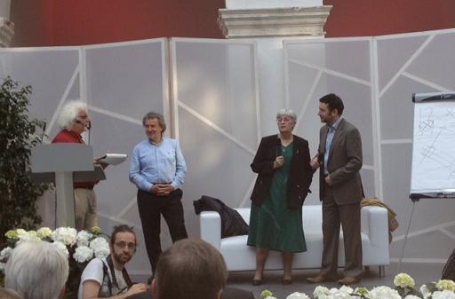 Alex Bellos riceve il Premio, accanto a lui (da sinistra) Patrizio Roversi e Piergiorgio Odifreddi