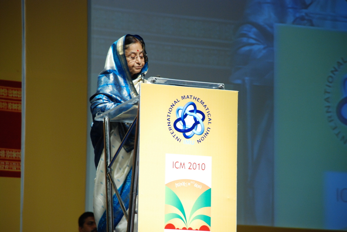 L’arrivo della Presidente dell’India, anche lei una donna, Smt. Pratibha Patil, è stato davvero emozionante: bassa di statura, con indosso un sari blu cobalto bordato d’argento, ha fatto il suo discorso emozionatissima, perché come tutti gli indiani presenti era orgogliosa che il suo paese, la cui tradizione matematica è indiscussa, ospitasse un evento di quella portata e lo ha detto chiaramente e con parole semplici. La guardavo e mi sembrava un Gandhi in abiti femminili: stesso viso magro, stessa statura, stesso carisma, stesso orgoglio.