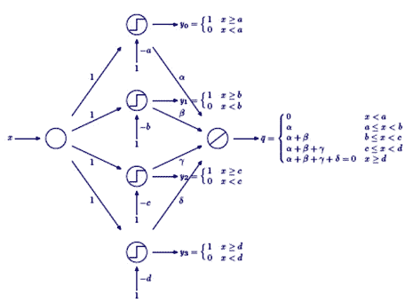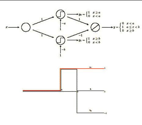 La rete neurale descritta nella Figura 12 definisce la funzione a scalini (il cui grafico è riportato in Figura 13) che è ottenuta come somma delle funzioni a gradino rappresentate nella Figura 14.