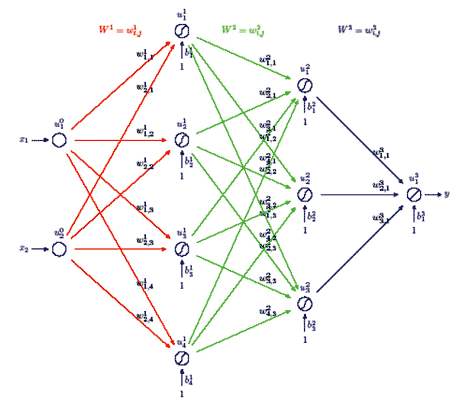 le cui dimensioni sono, rispettivamente, 2 x 4 , 4 x 3 , 3 x 1 , e dai vettori (bias):