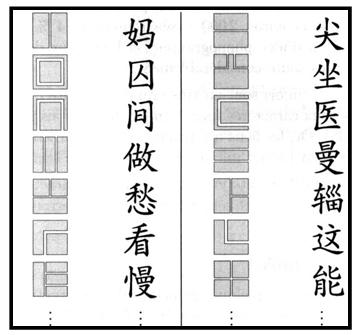 Elemento portante per tutto il lavoro di ricerca relativo alla seconda indagine sperimentale, contestualizzato attraverso una scelta metodologica quale quella della teoria delle situazioni di Brousseau (Brousseau, 1997), è stato la ferma convinzione dell’evidenza e rilevanza dell’integrazione dei saperi attraverso una possibile socializzazione degli stili cognitivi nella pratica didattica e nelle fasi di apprendimento, in particolar modo in condizioni di multiculturalità (fase di validazione della situazione a-didattica). Questo aspetto, relativo alla discussione delle contingenze sperimentali, è stato quindi l’elemento portante per la comprensione dei fenomeni di apprendimento messi in luce sul pensiero algebrico e l’integrazione dei saperi nella fase di transizione da quello aritmetico. In quest’ottica si è ritenuto necessario delineare inizialmente un breve iter storico-epistemologico capace di richiamare criticamente, in modo del tutto elementare, le fasi salienti del lungo e sofferto percorso compiuto dall’Algebra come evoluzione sull’Aritmetica e porre l’attenzione sul concetto di equazione come cuore dell’Algebra e come elemento significativo per l’indagine sperimentale. Contestualmente è stato posto l’accento sul Jiuzhang Suanshu, considerato testo rappresentativo della cultura matematica cinese antica. In esso si è cercato, seppur in una prima approssimazione di ritrovare alcune meta-regole classiche che sembrano configurarsi come fondamentali anche oggi per il pensiero algebrico e, sotto certi aspetti per la lingua cinese scritta. La figura 4 ne riporta alcune.