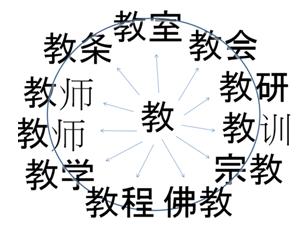 Particolarmente significativa nello studio “comparativo” è la sesta ed ultima categoria di classificazione dei caratteri cinesi (xíngshēng 形声) che si presenta come una categoria ibrida all’interno della quale l’elemento centrale che gioca un ruolo di classificazione è quello di “radicale”. La “chiave”, il radicale, secondo una lettura matematica evidenzierebbe da un lato un’incognita (un segno specifico ma “indeterminato” che assume il suo senso in relazione al contesto linguistico nel quale viene inserito); dall’altro lato però potrebbe assume il significato di segno generalizzato segno capace di veicolare il carattere nel quale esso è inserito e permettere al lettore l’identificazione di quest’ultimo. Ulteriore osservazione discussa nel lavoro in considerazione del binomio algebra-lingua cinese scritta è quella che viene fuori dall’analisi delle relazioni funzionali esistenti all’interno di un carattere composto, tra le varie parti che lo compongono. In questo senso, per quello che ci interessa specificatamente, la “chiave” assume il ruolo di parametro. Una schematizzazione di quanto detto può essere descritta attraverso l’immagine seguente che rappresenta i legami sintattici-semantici tra differenti caratteri tra loro “associati”.