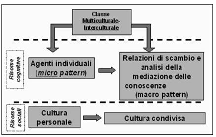 Volendo schematizzare la complessa situazione degli “agenti” che intervengono oggi in classi con allievi di differenti culture, si potrebbe utilizzare, seppur in una prima approssimazione lo schema raffigurato accanto (Di Paola & Spagnolo, 2010) che evidenzia micro e macro pattern che interagiscono all’interno del contesto classe sul sapere disciplinare in oggetto.