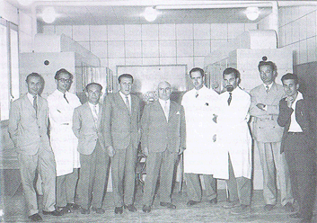 Roma, CNR 1955, il FINAC. Da sinistra verso destra: Corrado Bohm, Paolo Ercoli, Wolf Gross, Aldo Ghizzetti, Mauro Picone, Giorgio Sacerdoti, Roberto Vacca, Enzo Aparo, Dino Dainelli.