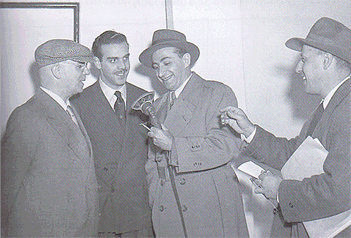 USA, agosto-settembre 1950: intervista di Picone alla Voice of America. Da sinistra: Mauro Picone, Gaetano Fichera, l'intervistatore Lupo.