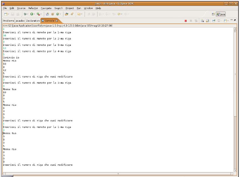 Nella parte principale (main) si inserisce in Input il numero (n) di mucchi (righe) successivamente, con un ciclo for si inseriscono i numeri di oggetti (vettore[i]) per mucchio, si convertono i numeri da notazione decimale a binaria e si registra la lunghezza del numero così ottenuto, si prende a riferimento la stringa di numeri più lunga (a3) e con la procedura di controllo si procede a verificare se la condizione di partenza è 'sicura' o 'pericolosa', si applica un controllo 'verticale' dei numeri espressi in forma binaria (cioè controllo tutte le a4-me cifre dei numeri in binario, se vett1[j].charAt(a4) vale '1' incremento il contatore). Se il computer scopre di essere in una posizione 'sicura' allora fa muovere l'utente, se si trova in una posizione 'pericolosa' muove per primo. Con la procedura miamossa il computer deicide la mossa: la mossa consiste nel togliere un oggetto per volta da un mucchio e controllare se vi sia un situazione 'sicura', in caso contrario si rimette tutto a posto. Con la procedura tuamossa l'utente fa la sua mossa ed il computer si limita a registrare i dati. La procedura controlfine permette di verificare se la configurazione finale risulta di tutti zeri. Si potrebbe far notare agli studenti che il programma così strutturato è piuttosto complesso e invitare alla compilazione di uno più 'economico'.