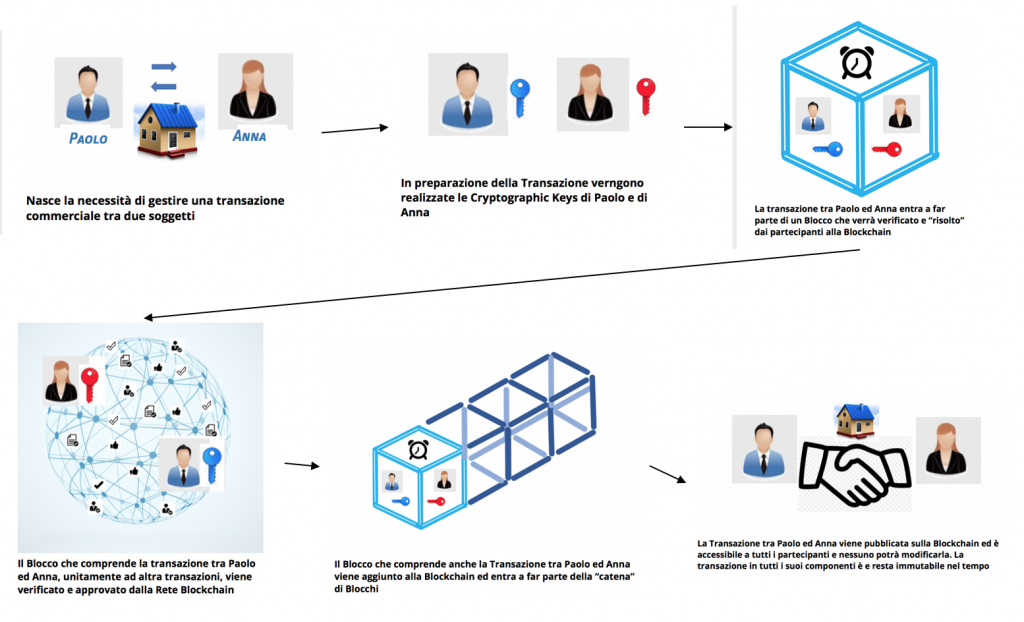 Se volessimo definire (informalmente) la blockchain, potremmo dire che è una sorta di libro mastro pubblico e decentralizzato che, sfruttando la tecnologia peer-to-peer, valida le transazioni tra due parti in modo sicuro, verificabile e permanente. Le tecnologie alla base del funzionamento della blockchain sono tutte soluzioni informatiche già note e vanno dal file sharing alla crittografia, in particolare quelle a chiave pubblica e privata (in cui chiunque può cifrare un messaggio usando la chiave pubblica del destinatario, ma tale messaggio può essere decifrato solo con la chiave privata del destinatario) e hash (che data una stringa di una qualsiasi lunghezza ne produce una di una lunghezza definita da cui non è possibile risalire alla stringa originale), ma la rivoluzione è stata la loro unione nel formare quella che appunto viene chiamata "catena di blocchi".