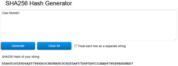 Fig. 2 Stringa generata dal messaggio "Ciao mondo!" con un generatore SHA256