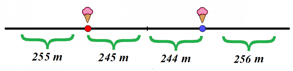 La concorrenza tra i due si gioca al centro. Il gelataio di sinistra decide allora di spostarsi verso destra di 5 metri: in questo caso, i potenziali acquirenti che stanno alla sua sinistra andrebbero comunque da lui in quanto più vicino, ma lui eroderebbe così clienti dal suo concorrente. Il gelataio di destra, altrettanto scaltro, decide quindi di spostarsi di 6 metri verso sinistra erodendo ancora più clientela al gelataio concorrente.