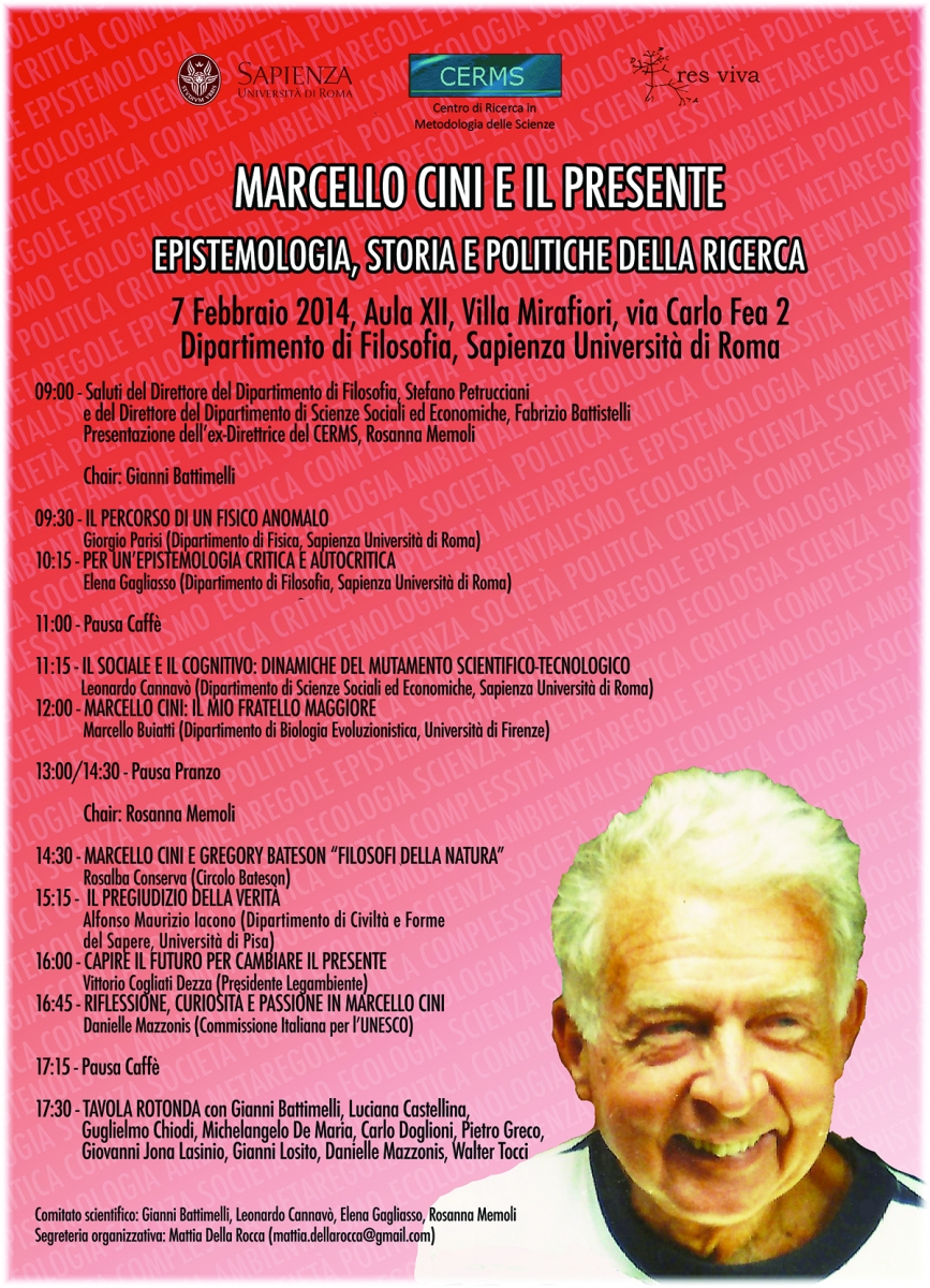 Per ricordare il grande fisico e intellettuale italiano Marcello Cini, scomparso il 22 ottobre 2012 all'età di 89 anni, il prossimo 7 febbraio presso l'Università di Roma "La Sapienza" si terrà un Convegno in sua memoria dal titolo "Marcello Cini e il presente: Epistemologia, Storia e politiche della ricerca".