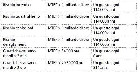 Consideriamo una metropolitana su gomma: in alcune città (in cui e importante che i treni del metro possano accelerare e decelerare in fretta) i convogli invece delle ruote di ferro hanno le gomme, come le auto. Se un treno su gomma partisse con un freno tirato, i suoi pneumatici si potrebbero surriscaldare per l’attrito con le rotaie fino a esplodere o incendiarsi. Questo guasto potrebbe diventare pericoloso per la sicurezza dei passeggeri, che potrebbero rimanere intossicati. L’obiettivo e severo: MTBF > 1 miliardo di ore.