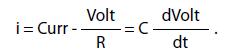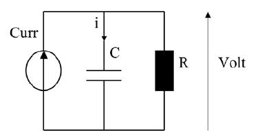 Il generatore di corrente Curr rappresenta la corrente che i motori restituiscono durante la frenatura. La corrente Curr si ripartisce tra il condensatore C, presente nella catena di trazione, e il reostato di frenatura rappresentato dalla resistenza R. Descriviamo l’evoluzione della tensione ai capi del reostato, Volt. Ai capi di una resistenza la tensione e proporzionale alla corrente: Volt = RiR.