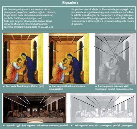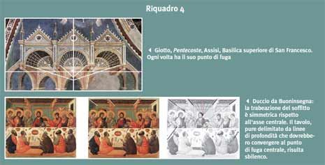 È forse nel cantiere della Basilica superiore di San Francesco ad Assisi, dove Cimabue e Giotto lavorano insieme, che nascono le prime sperimentazioni [5]. Nella raffigurazione della Madonna sul trono, immagine molto diffusa nel Medio Evo, per dare il senso della profondità, il trono veniva solitamente rappresentato secondo una visione insieme frontale e obliqua, mostrando il lato laterale con parallelogrammi. Cimabue, per primo, rompe questa consuetudine e introduce un asse di simmetria centrale che dà al-l’insieme una maggiore compostezza e regolarità. L’introduzione di questa simmetria porta come conseguenza che i segmenti che si corrispondono nella simmetria, se prolungati, andranno (per ovvie ragioni geometriche) ad incontrarsi sull’asse di simmetria. È su questo schema e non tanto su una presunta struttura “a lisca di pesce” ereditata dagli antichi – come sostiene Panofsky – che Giotto imposta le sue prime sperimentazioni. È chiaro che l’attenzione del pittore è tutta rivolta solo ai soffitti, elemento decorativo scelto per dare l’idea della profondità dell’ambiente senza armonizzare questo coi pavimenti. Anche è chiaro come in Giotto manchi l’idea unificante che tutte le linee di profondità convergano a uno stesso punto di fuga dove si congiunge tetto a suolo. Il pittore non dispone di uno schema geometrico globale ma riesce solo ad applicare localmente, per parti parziali del dipinto, l’apparente convergenza delle linee parallele (come si vede ad esempio nel suo affresco Pentecoste). Anche altri maestri come Duccio da Buoninsegna o i fratelli Lorenzetti cercheranno la soluzione al problema di come rappresentare la profondità, senza trovarla. Sarà il rinascimento scientifico – il grande fervore al tempo stesso umanista e scientifico – a riportare alla luce l’interesse per gli antichi testi. L’Ottica di Euclide viene editata manoscritta nel 1458 proprio a Borgo San Sepolcro dove è nato Piero della Francesca. Brunelleschi, Alberti, Leonardo da Vinci, e lo stesso Piero, daranno corpo a regole precise e geometricamente corrette per la rappresentazione prospettica. Si recupera l’impianto euclideo basato sui raggi visivi e sul cono visivo che ha come vertice l’occhio e come base i contorni della cosa vista. La prospettiva diventa di nuovo Matematica, diventa lo studio dell’intersezione di un determinato cono con il piano del quadro. Ogni figura si proietta a partire dall’occhio, con delle rette (i raggi visivi) su un piano. Il problema diventa un problema puramente geometrico e tutto diventa un capitolo di quello che Poncelet, il fondatore della moderna Geometria proiettiva, chiamerà la Teoria delle proiezioni centrali.