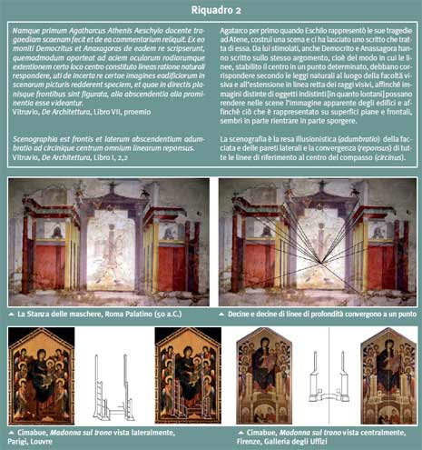 Non è un caso che, in tutta la pittura medioevale, questa regola non venga mai rispettata. Siamo invece convinti che il teorema della geometria della visione, che afferma l’apparente convergenza di segmenti paralleli, fosse ben noto ai pittori greco-romani (a partire per lo meno dal terzo secolo avanti Cristo) e crediamo che, di conseguenza, fosse anche noto il suo riscontro nella pratica della pittura. Ciò non significa che essi l’abbiano applicato ovunque. Al contrario, la regola, specie in grandi affreschi, è – pensiamo consapevolmente – spesso disattesa per ottenere effetti estetici di natura diversa. Questa tesi non è condivisa da Panofski [2] che invece, anche sulla base delle poche pitture antiche disponibili all’epoca, sostiene l’ipotesi di una prospettiva antica “curva” come la superficie retinica, nella quale segmenti paralleli tra loro convergono a due e due a punti diversi disposti lungo un asse verticale, formando uno schema tipo “lisca di pesce”. Pensiamo che oggi vi siano invece elementi sufficienti per poter dipanare la questione in modo definitivo nella direzione contraria a quella indicata da Panofsky. Anche se l’Ottica di Euclide non è un manuale ad uso dei pittori, né ce ne sono pervenuti altri di questa natura, tuttavia riteniamo che la testimonianza di Vitruvio sia molto importante. Nei suoi 10 libri sull’Architettura, Vitruvio non solo parla di scenografia nel senso di rappresentazione di un edificio secondo la sua immagine prospettica, mostrando sia la facciata che le pareti laterali, ma in un certo senso indica anche alcuni suggerimenti su come concretamente realizzare tali “scenografie”. Riportiamo nel riquadro 2 i due passi di Vitruvio, per alcuni versi oscuri e sui quali si è molto dibattuto, essendo questa la testimonianza più importante rispetto al problema che vogliamo affrontare.