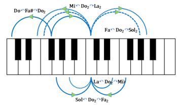 Nella sequenza Do1 (semitono +1), Fa# (+7), Do2 (+13), Fa#2 (+19), Do3 (+25) ogni nota si alterna nella posizione centrale e determina così ben cinque legature armoniche (non solo quella dell’ottava !), che nell’arco +1∩+13 risultano essere: