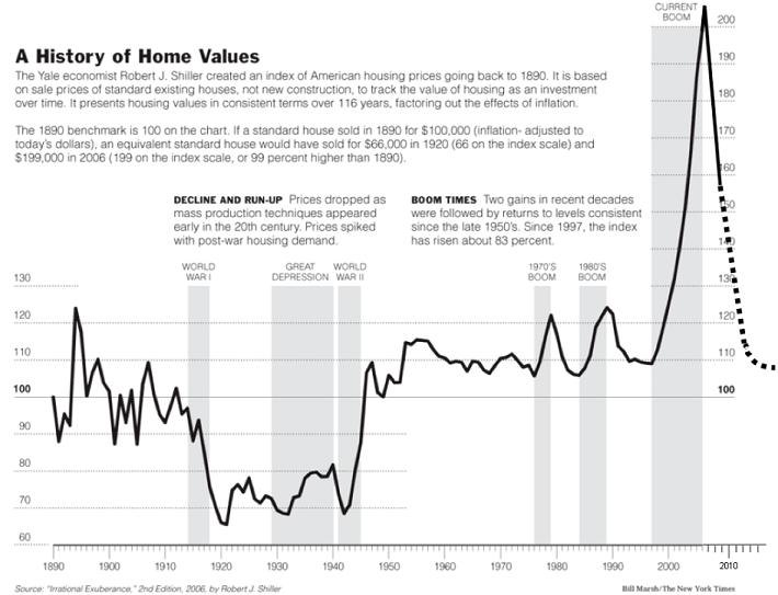 A quanto pare quindi scommettere su chi vincerà il premio in un determinato anno resta un compito non facile, ma identificare il nome di un possibile futuro vincitore del riconoscimento senza una precisa scadenza, sembra un compito più agevole. Suona curioso quindi che uno dei meriti principali del professor Shiller sia stato proprio quello di dimostrare come per le previsioni nei mercati finanziari avvenga qualcosa di analogo. Indovinare in anticipo se la quotazione di un certo titolo salirà o scenderà nel breve periodo risulta essere un compito difficile, al limite della divinazione, mentre in determinate circostanze è possibile fare previsioni di medio-lungo periodo. In uno dei suoi articoli scientifici più noti (intitolato “Is there a bubble in the housing market?”), Shiller in tempi non sospetti (l’articolo è stato pubblicato nel 2003) mette in guardia sull’inverosimilmente alto valore attribuito alle abitazioni sul mercato immobiliare statunitense (real estate US market). Non è difficile oggi vedere in lui una Cassandra moderna quando nel suo libro “Irrational Exuberance”, profetizza un drammatico scoppio di quella che secondo lui è a tutti gli effetti una enorme bolla speculativa venutasi a creare in questo mercato. Siamo nel 2005 e neanche tre anni dopo la profezia di Shiller si dimostra drammaticamente accurata. Il suo Oracolo è un indice creato insieme al collega Karl Case (Case-Shiller index) e costruito accumulando una grande mole di dati relativi a molte città degli USA, a partire dal 1890. Il grafico può essere considerato a tutti gli effetti un’istantanea del mercato appena prima della crisi e rende palese l’anomalia: