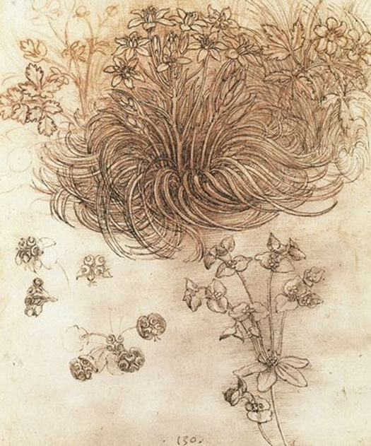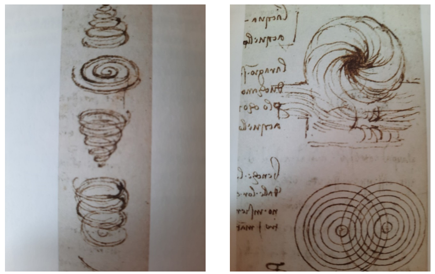 Nel caso di Leonardo da Vinci (1452-1519) siamo sempre infinitamente sorpresi e profondamente attratti dai disegni e dai dipinti, osservando i quali salta subito all'occhio la precisione, potremmo dire scientifica, e la continua presenza di rappresentazioni relative a linee e superfici matematiche. In particolare spirali, forme elicoidali, vortici si possono ammirare in molte opere riferite ai diversi campi di indagine da lui affrontati a partire, ad esempio, dagli studi sui corsi d'acqua. Sempre, in tutta la sua vita, Leonardo è stato affascinato dalla morfologia dell'acqua che notava essere somigliante a quella dell’aria, del sangue e di ogni altro fluido.