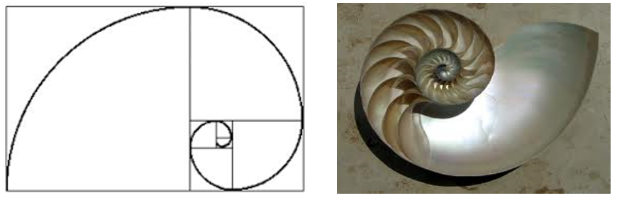 All'interno del rettangolo aureo di partenza, utilizzando tutti i punti di separazione tra i quadrati e i rettangoli successivi, è possibile descrivere una spirale logaritmica che viene detta spirale aurea ed è appunto la configurazione che si trova nelle forme di alcune conchiglie (ad esempio nel Nautilus), di molti fossili, di molte infiorescenze: questa curva è considerata come uno degli attrattori fondamentali della forma della crescita degli organismi viventi. Proprietà fondamentale e intrinseca della spirale equiangolare e quella dell'autosomiglianza ed è proprio per questa proprietà che tale curva è associata all'accrescimento organico di strutture quali le corna di alcuni animali e le conchiglie. Nelle conchiglie la crescita a spirale assicura che esse non alterino la loro forma mentre crescono. Ogni incremento è simile al precedente e ogni ciclo di accrescimento resta della forma primitiva.