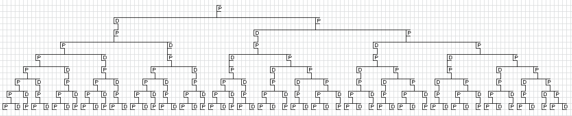 Costruiamo qui di seguito le sequenze di pari (P) e dispari (D) facendo in modo che il numero dispari sia seguito alternativamente da uno e da due numeri pari e che, quando è seguito da due pari, a questo faccia seguito alternativamente un dispari o un altro pari (potremmo ulteriormente proseguire alternando, dopo il terzo pari, un dispari e un pari, ma non lo facciamo, sempre a nostro svantaggio).