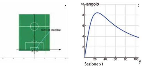 descrive come varia la tangente dell’angolo υ, sotto cui il giocatore vede la porta, in funzione della posizione del giocatore lungo la linea del fallo laterale.