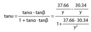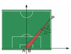 Le coordinate del giocatore sono quindi P = P (34, y), 0 ≤ y ≤ 105 . Se il giocatore si trova presso la bandierina del calcio d’angolo (y = 0) l’angolo di visuale υ è nullo. In ogni altra posizione, lungo la linea del fallo laterale (y > 0), risulta υ = α - β ove α = APQ e β = BPQ . Tenuto conto della risoluzione dei triangoli rettangoli e della formula di sottrazione della tangente, si ottiene: