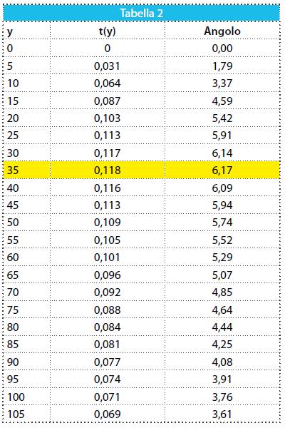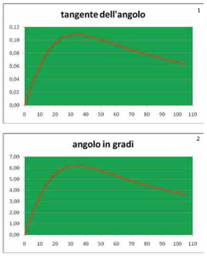 Discussione del modello. Affrontiamo la questione con strumenti elementari. Tabuliamo la funzione t (Tabella 2 – I e II colonna) ed osserviamo il grafico corrispondente (Fig. 3.1). Mentre il giocatore si allontana dalla bandierina del calcio d’angolo lungo la linea del fallo laterale, i valori della funzione t prima crescono, poi decrescono. Evidentemente c’e una posizione nella quale la tangente dell’angolo di visuale e massima. Questa posizione può essere localizzata intorno a 35 metri. In questa posizione anche l’angolo di visione e massimo? Per rispondere alla domanda confrontiamo i valori della tangente con quelli dell’angolo corrispondente (cfr. Tabella 2 – II e III colonna). La tabella e i grafici corrispondenti (cfr. Fig. 3) mostrano chiaramente che al valore massimo assunto dalla tangente corrisponde il massimo angolo.