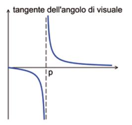 Discussione del modello. La funzione che abbiamo ottenuto non è definita per y = p. Del resto, come abbiamo già osservato, per y = p l'angolo di visuale è retto e, come è noto, la tangente presenta un asintoto verticale in corrispondenza a tale angolo (cfr. Fig.6). Il modello non è quindi adatto allo scopo che ci siamo prefisso ed occorre modificarlo. Affronteremo la questione nel caso generale.