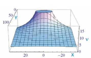 Discussione del modello. Approccio soft. La precedente funzione coseno non e definita nei punti P(±p, 0), ovvero sui pali della porta, ove l'angolo di visuale e indefinito. Si tratta di una funzione di due variabili il cui grafico (tracciato con l’aiuto di un software) e riportato in Fig. 8.