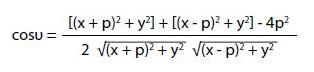 Poiché, come abbiamo visto nel punto precedente, la funzione tangente non si rivela adatta a descrivere angoli che passano con continuità da acuto ad ottuso, occorre cambiare funzione trigonometrica. Fra quelle elementari, la funzione coseno e l'unica ad essere biunivoca per angoli che variano da 0° a 180°, come nel caso di nostro interesse. Proviamo allora a descrivere l'angolo di visione mediante il suo coseno.
