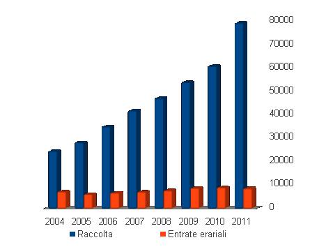Figura 1: Raccolta totale ed entrate erariali del gioco d'azzardo in Italia (dati in milioni di Euro, fonte AAMS)