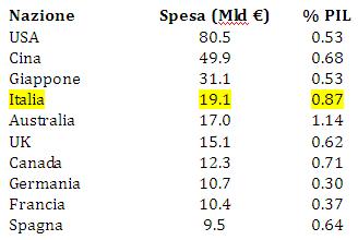 Se si considera il dato ancora più significativo della spesa per il gioco d'azzardo (ottenuta sottraendo alla raccolta le vincite restituite ai giocatori), si nota (Tabella 1) che l'Italia è ai primi posti al mondo per spesa assoluta, e addirittura al secondo posto (dopo l'Australia) per spesa rispetto al PIL. Nel 2011, la spesa per gioco d'azzardo in Italia è stata pari allo 0.87% del PIL, ovvero una percentuale molto vicina a quella che lo Stato italiano investe per l'Università e la ricerca scientifica.