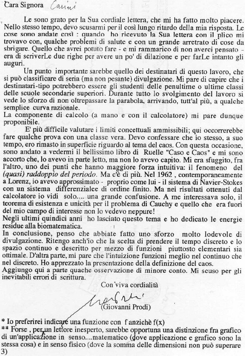 la scomparsa di Giovanni Prodi ha fatto venire in mente a Rosa Carini e a me che nel 2001 gli avevamo spedito il manoscritto di quello che sarebbe poi diventato il libro "Sulle Orme del Caos" (scritto con Laura Gardini e Paolo Tenti, pubblicato da Bruno Mondadori). Lui ci aveva risposto con una bella lettera, che allego, indirizzata personalmente a Rosa Carini.