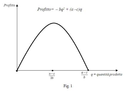il cui grafico è una curva ben nota a ogni studente dei primi anni delle scuole medie superiori: una parabola concava, come quella in figura 1, caratterizzata da un punto di massimo, il vertice. In questo nuovo modello i profitti sono nulli non solo quando produco q=0 (ovviamente se non produco con guadagno) ma anche quando produco troppo, ovvero per q³(a-c)/b. E a metà fra questi due valori sta la produzione che mi dà il massimo guadagno.