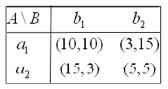 dalla quale è evidente, in base al principio di razionalità, che verrà scelta la coppia di strategie (a2, b2) che fornisce un payoff pari a 10 a ciascun giocatore. Ora aggiungiamo un'ulteriore strategia per ciascun giocatore, conservando intatta la sottomatrice associata alle due strategie già esistenti, come mostra la seguente matrice del gioco con tre strategie ciascuno: