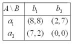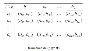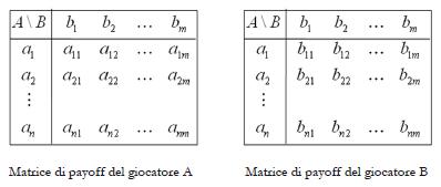 Cerchiamo ora di rappresentare, nel formalismo della teoria dei giochi, un problema di scelta che coinvolge l'interazione strategica fra due giocatori A e B. Siano a1, ...,an le n azioni disponibili per il giocatore A e siano b1, ...,bm le m azioni fra cui può scegliere il giocatore B. L'utilità uA del giocatore A dipende sia dalla propria scelta che da quella di B, indichiamo con aij= uA(ai,bj) l'utilità (o payoff) che si aspetta il giocatore A in seguito alla propria scelta dell'azione ai e dell'azione bj da parte del giocatore B. Analogamente, sia bij= uB(ai,bj) il payoff che si aspetta il giocatore B in seguito alla stessa coppia di scelte. La notazione utilizzata ci permette di sistemare il tutto sotto forma di matrici, dette matrici dei payoff, in cui si riportano le n strategie del giocatore A sulle righe le m del giocatore B sulle colonne, rispettando così la solita convenzione dell'algebra matriciale di intendere il primo pedice di ogni elemento come indice di riga e il secondo come indice di colonna.