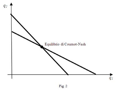Ma dove i ragionamenti sembrano troppo complicati ci vuole un po' di matematica per schematizzare le cose. Proprio quello che nel 1838 fece il matematico francese Antoine Augustin Cournot, che nel trattato Récherches sur les principes matématiques de la théorie de la richesse affrontò il problema come segue. Se il produttore 1 calcola, per ogni possibile produzione q2 del suo concorrente, la propria produzione ottimale, ottiene come grafico una retta (infatti q1max è una funzione di primo grado in q2) che rappresenta il luogo delle sue produzioni ottimali al variare della produzione del concorrente. Analogamente, il produttore 2 può calcolare, per ogni possibile produzione q1 del suo concorrente, la propria produzione ottimale q2max ottenendo anche lui come grafico una retta. Bene, disse Cournot, se riportiamo le due rette sullo stesso piano, come in fig. 2, si vede subito che esiste un solo punto ottimale per entrambi: il punto di intersezione. Calcolarlo è semplice: basta risolvere il seguente sistema lineare di due equazioni in due incognite q1 e q2: