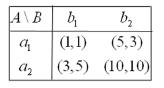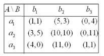 È chiaro che, in base al principio di razionalità, il giocatore A non sceglierà mai la strategia a1 in quanto otterrebbe un payoff minore rispetto alla scelta alternativa, qualunque sia la decisione di B fra le tre strategie a sua disposizione. A questo punto, sapendo che la scelta di A cadrà senz'altro su a2, osservando la seconda riga della matrice il giocatore B scarterà l'azione b3, mentre mostrerà indifferenza fra le opzioni b1 e b2. Potrebbe scegliere b1 se, a parità di payoff per sé, desidera danneggiare A, b2 se invece desidera favorirlo. Oppure potrebbe patteggiare con A dicendogli che è disposto a scegliere b2 a patto che A gli conceda una quota della maggiore vincita (3 invece di 2) che con tale scelta gli consente di ottenere. Ma in questo modo stiamo uscendo dalle regole del gioco, avventurandoci verso accordi cooperativi che ne costituiscono una possibile estensione.