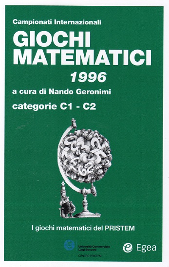 Continua con questo volume la pubblicazione dei testi assegnati nelle gare matematiche organizzate nei vari anni dal Centro PRISTEM dell'Università Bocconi. Si tratta in questo caso del 1996. Il colore verde della copertina segnala che in particolare i "giochi" qui raccolti sono quelli assegnati alle categorie C1 (prima e seconda media) e C2 (terza media e primo anno delle superiori).